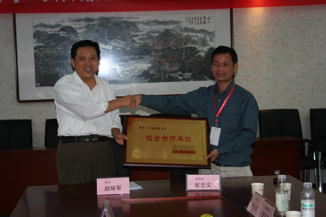 校长赵耀军代表学校对崔忠义总经理一行到来表示热烈的欢迎,对双方合作协议的签署表示祝贺。学校针对企业人力资源发展及企业技术需要,为职工人员培训、科技合作交流,学校为企业开展订单式人才培养,双方根据技术建立学生实习基地,双方共同建立技术交流研讨、科技攻关机制,是高校与企业共同发展的战略需求,是双方合作的延伸与深度发展,对实现合作共赢有着重要的意义。