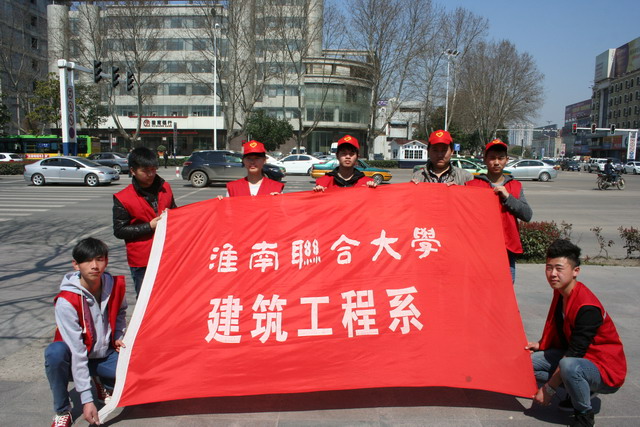 2014年3月23日建工系学生会成员前往洞山十字路口、市政府组织了“学雷锋、做好事”义务执勤站岗活动。活动中,志愿者头戴红帽,身穿马甲毅然地站在车水马龙的路边,有序的指挥着交通。对于初出茅庐的大一新生来说,不免有点羞涩和紧张,但他们看上去毫无畏惧,克服各种心理障碍,积极的帮助老人扶到对面去,主动的向违反交通规则的行人进行劝导。虽然有少部分行人对他们视而不见,或者是冷眼相看,但更多行人还是文明、理智的接受志愿者们真诚的建议,并及时纠正违规行为。为淮南市创建省级文明城市做出自己微薄的力量。