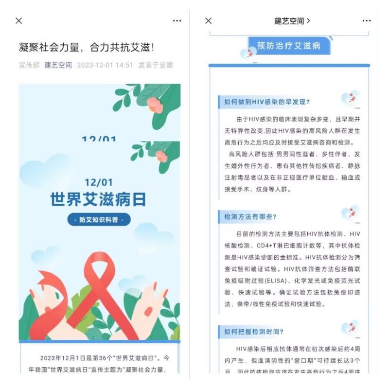 在网络平台上,通过学院官方网站和“建艺空间”公众号推送艾滋病防治宣传教育,让同学们通过信息化手段更加关注艾滋病防治工作;在主题班会上,各班级围绕艾滋病防治主题,开展了丰富多彩的宣传教育活动。通过观看防艾知识宣传片、发放大学生预防艾滋病宣传手册、讲解艾滋病的基本知识、传播途径和预防措施等内容,使同学们更加深入地了解艾滋病的相关知识。此外,各班级还组织了小组讨论,让同学们分享自己的观点和看法,共同探讨如何在日常生活中做好艾滋病的预防工作。
