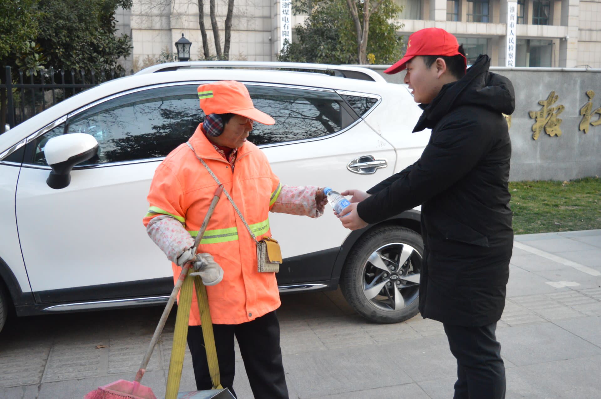 3月9日上午6点,全体成员带上预先准备的饮用水,集合出齐,分成两队。一队由学生会干部带领,骑共享单车沿洞山西路向东直行,为沿途的环卫工人们送去饮用水。另一队由各部部长带领,沿洞山西路步行送水。