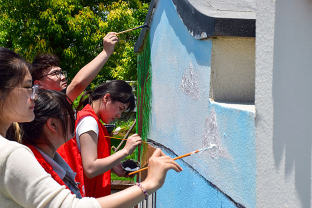 抵达王楼村后,服务队迅速分组创作。队员们以“淮南小洱海”风光实景为蓝本,在村门口的墙面上勾勒出绿茵草坪、垂柳与淡蓝湖面,原本单调的墙面化作流动的春日画卷。